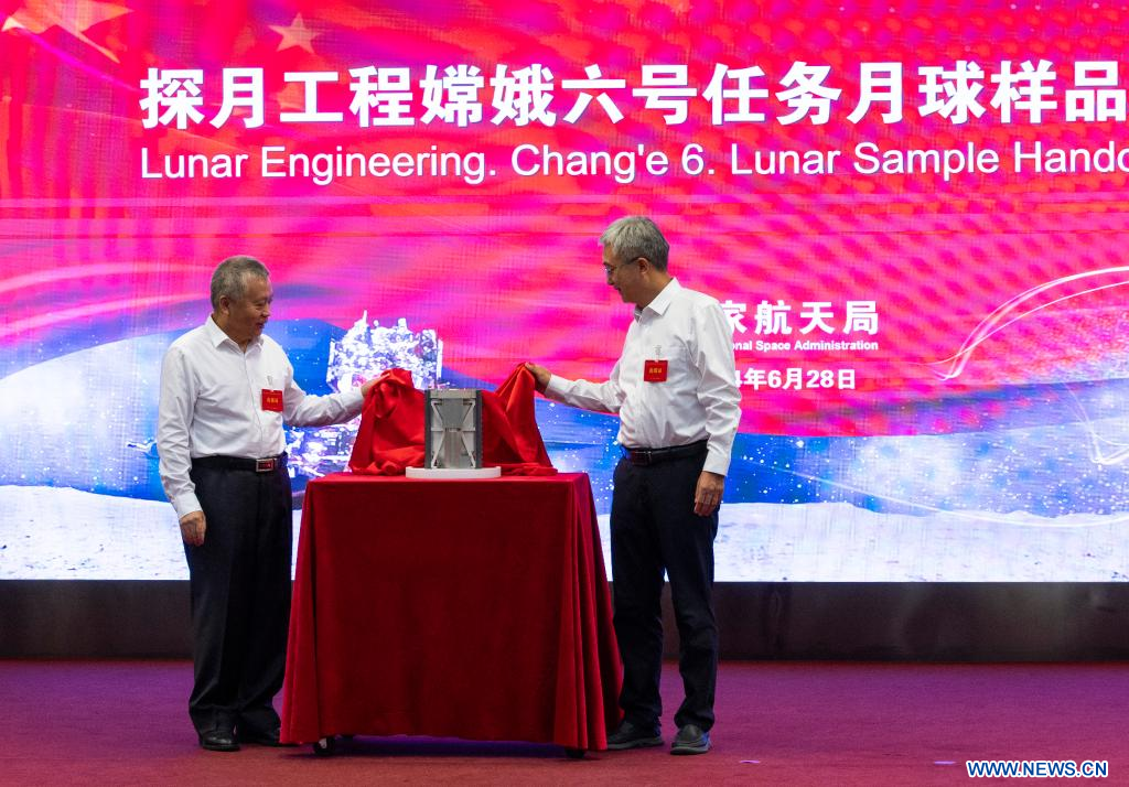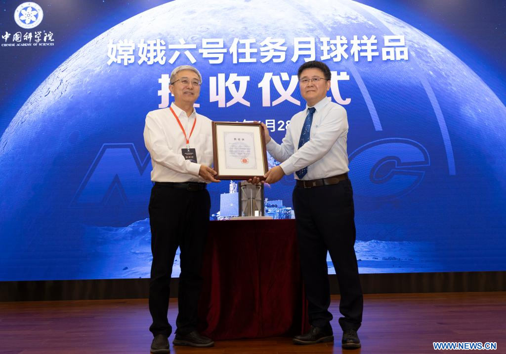 Zhang Kejian, directeur de la CNSA, a remis le conteneur d'échantillons à Ding Chibiao, vice-président de l'Académie des sciences de Chine (ASC), ainsi que le certificat d'échantillons lors d'une cérémonie qui s'est tenue à Beijing.