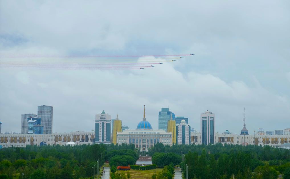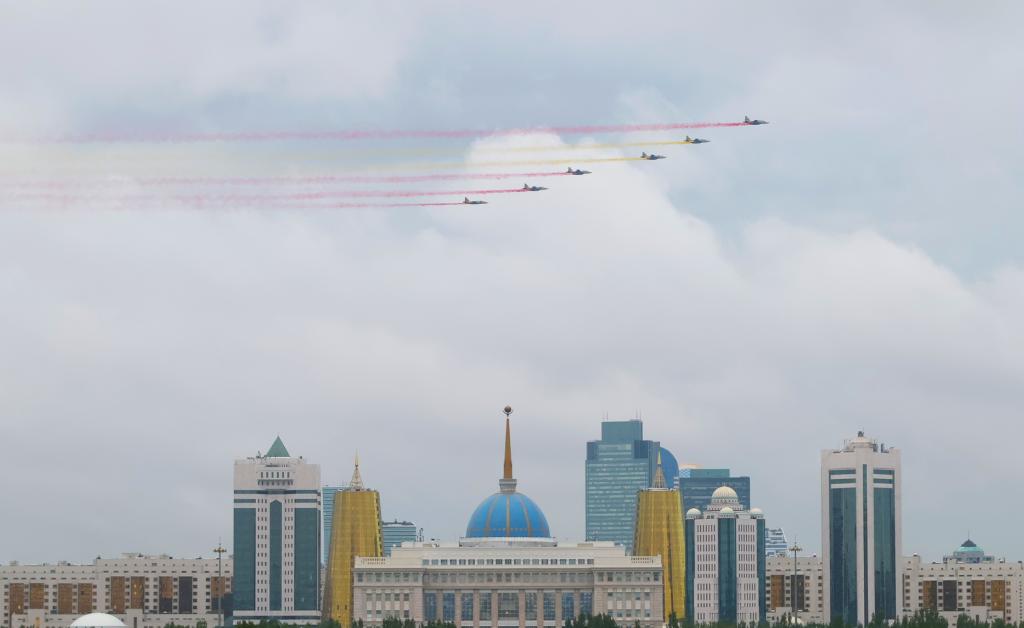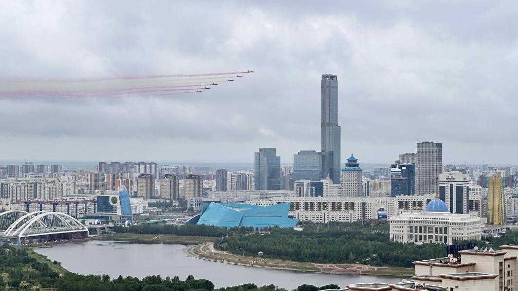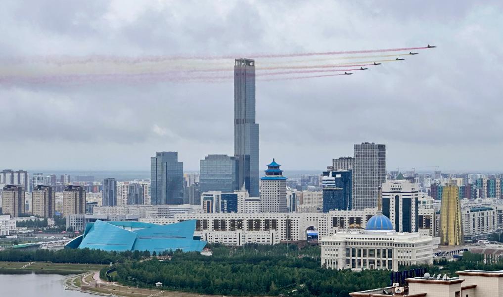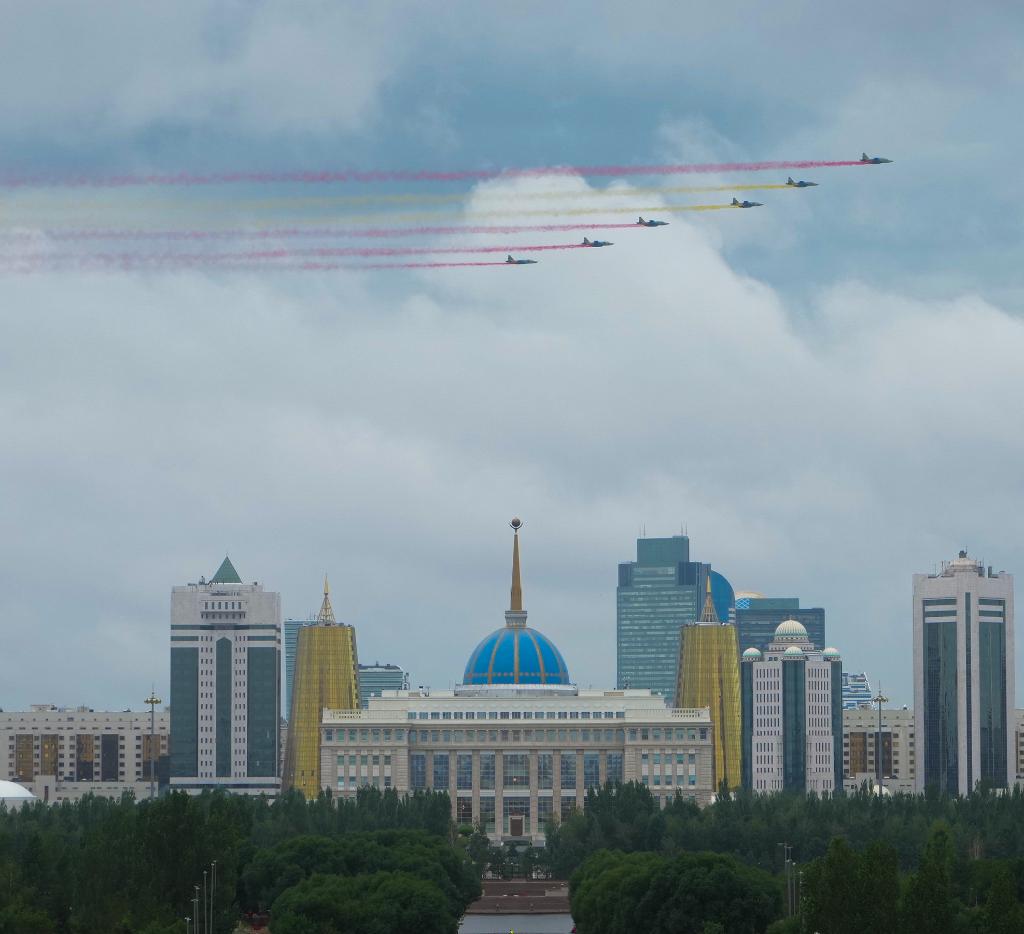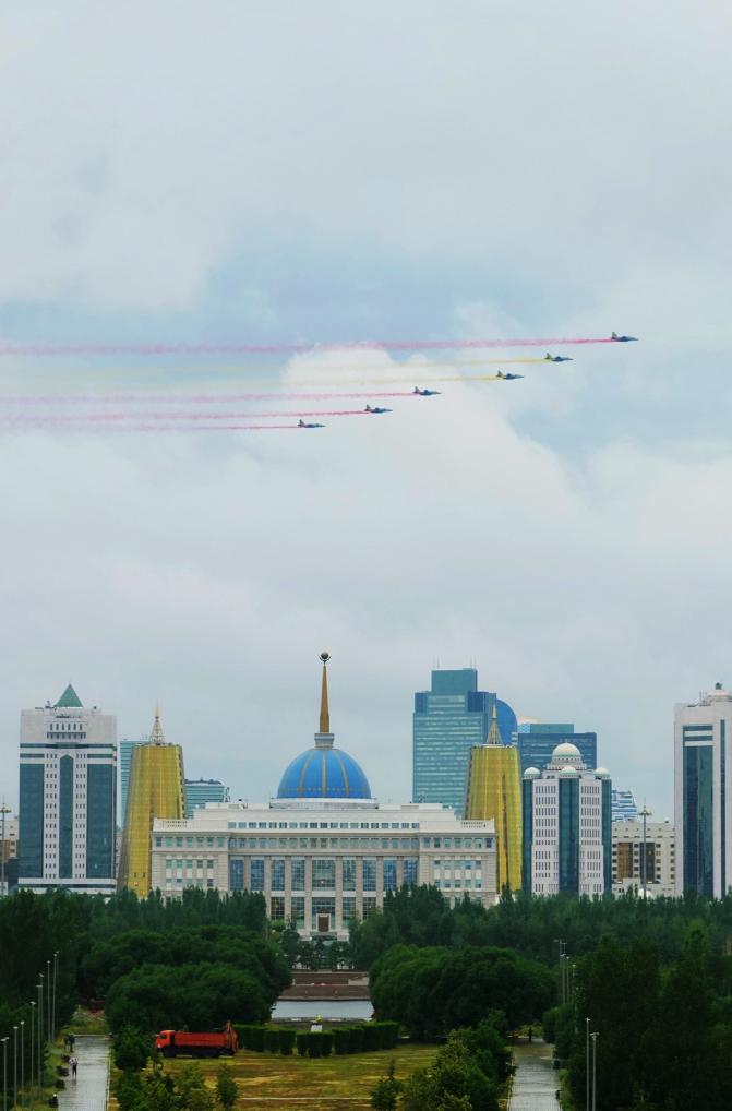 ASTANA, 3 juillet (Xinhua) -- Les chasseurs kazakhs ont peint le ciel d'un sillage de fumées colorées alors que le président kazakh Kassym-Jomart Tokaïev a organisé mercredi une cérémonie de bienvenue pour le président chinois Xi Jinping.