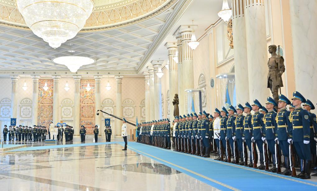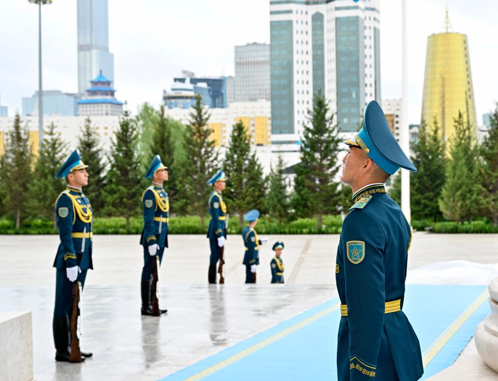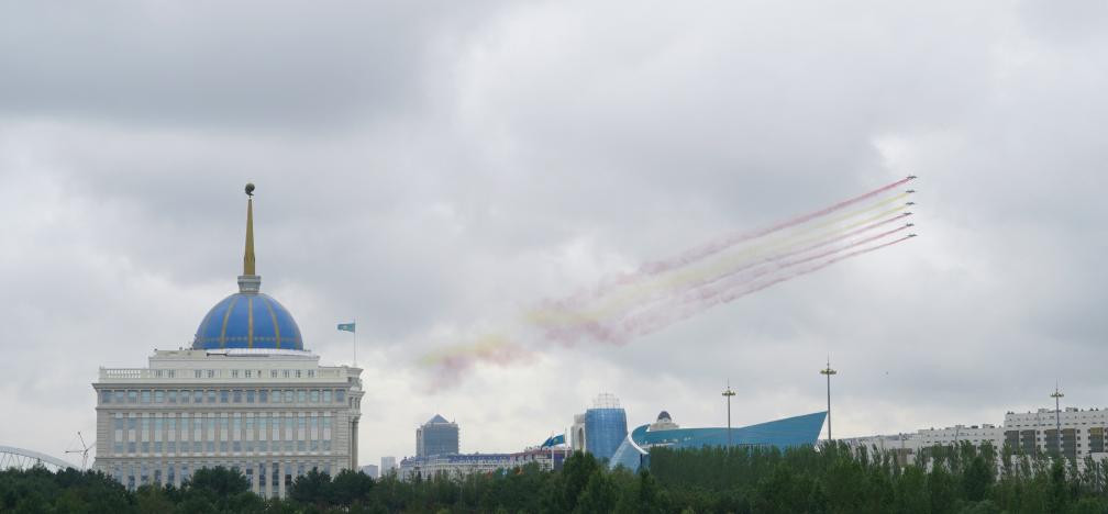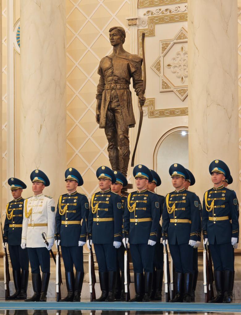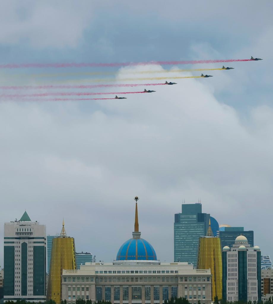 ASTANA, 3 juillet (Xinhua) -- Les chasseurs kazakhs ont peint le ciel d'un sillage de fumées colorées alors que le président kazakh Kassym-Jomart Tokaïev a organisé mercredi une cérémonie de bienvenue pour le président chinois Xi Jinping.