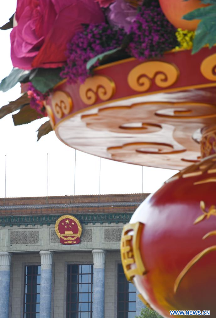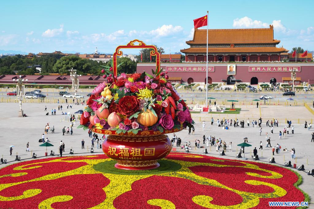 BEIJING, 25 septembre (Xinhua) -- La place Tian'anmen et l'avenue Chang'an, à Beijing, ont été décorées de fleurs à l'approche des congés de la fête nationale.