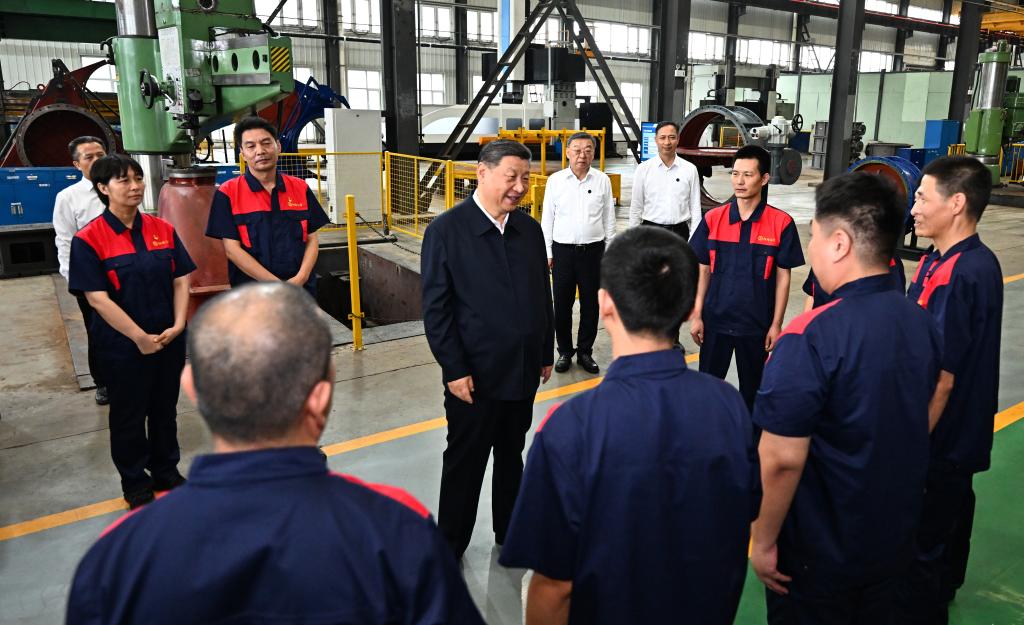 YANGQUAN, Shanxi, 7 juillet (Xinhua) -- Xi Jinping, secrétaire général du Comité central du Parti communiste chinois, a inspecté lundi après-midi une entreprise de fabrication de vannes à Yangquan, dans la province chinoise du Shanxi (nord), où il s'est informé des efforts déployés par la province pour promouvoir la transformation et la montée en gamme des industries, ainsi que le développement de haute qualité.