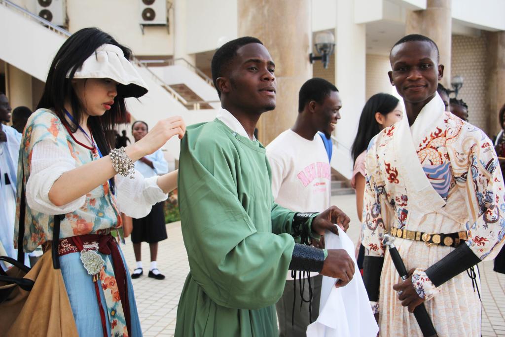 Des étudiants de l'Institut Confucius de l'Université d'Abomey-Calavi préparent les tenues traditionnelles chinoises pour le défilé de mode Chine-Bénin sur la place centrale du Palais des Congrès à Cotonou, au Bénin, le 8 novembre 2025. (Xinhua/Seraphin Zounyekpe)