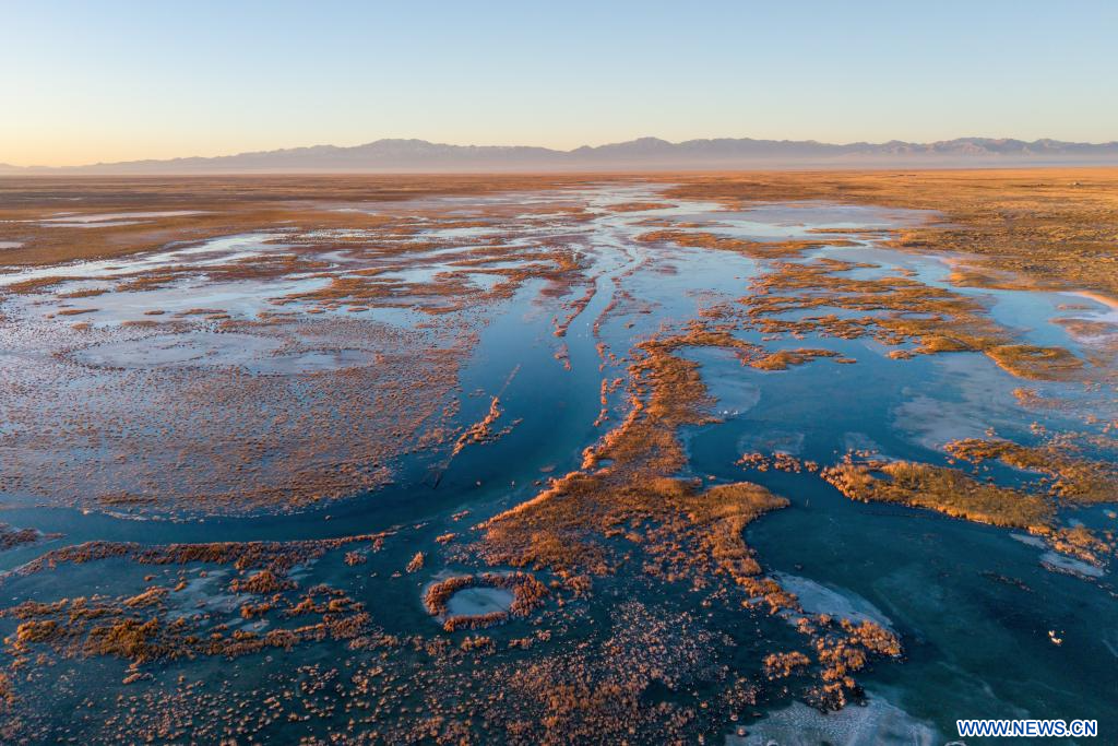 AKSAY, 17 novembre (Xinhua) -- Photo aérienne du lac Xiaosugan, situé dans le district autonome kazakh d'Aksay, à Jiuquan, dans la province chinoise du Gansu (nord-ouest), le 14 novembre 2025.