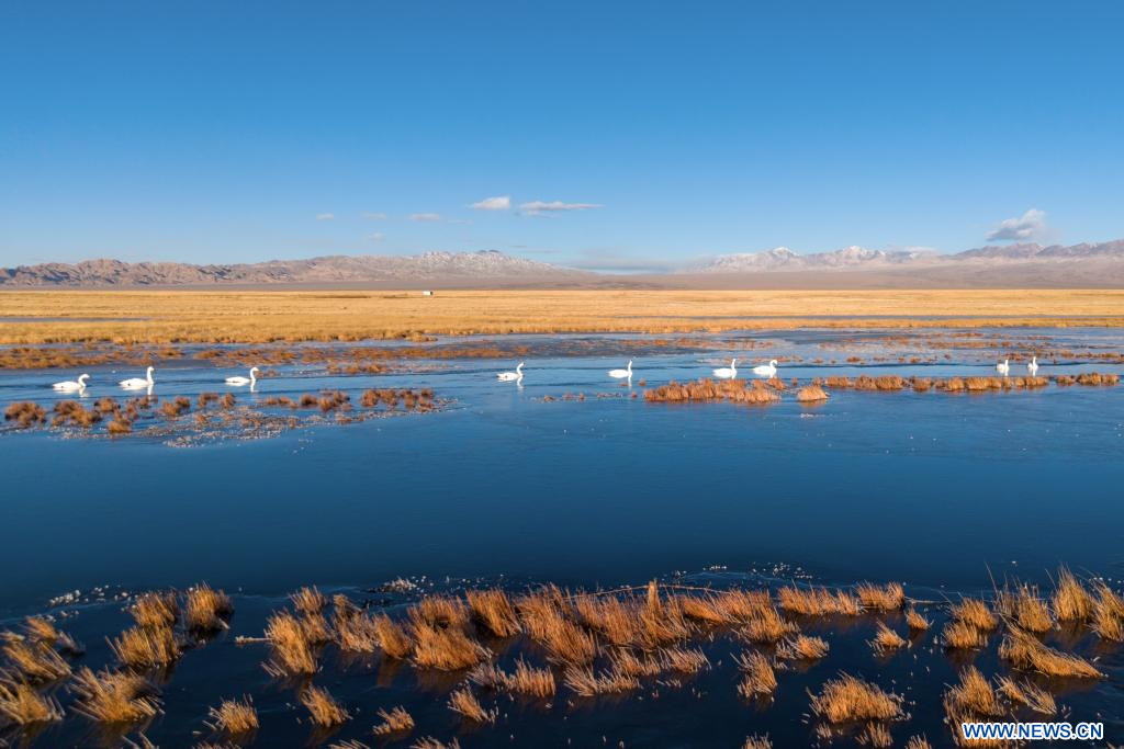 AKSAY, 17 novembre (Xinhua) -- Photo prise par drone montrant des cygnes chanteurs dans la zone humide du lac Xiaosugan, situé dans le district autonome kazakh d'Aksay, à Jiuquan, dans la province chinoise du Gansu (nord-ouest), le 14 novembre 2025.