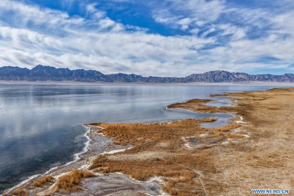 AKSAY, 17 novembre (Xinhua) -- Photo aérienne du lac Dasugan, situé dans le district autonome kazakh d'Aksay, à Jiuquan, dans la province chinoise du Gansu (nord-ouest), le 16 novembre 2025.